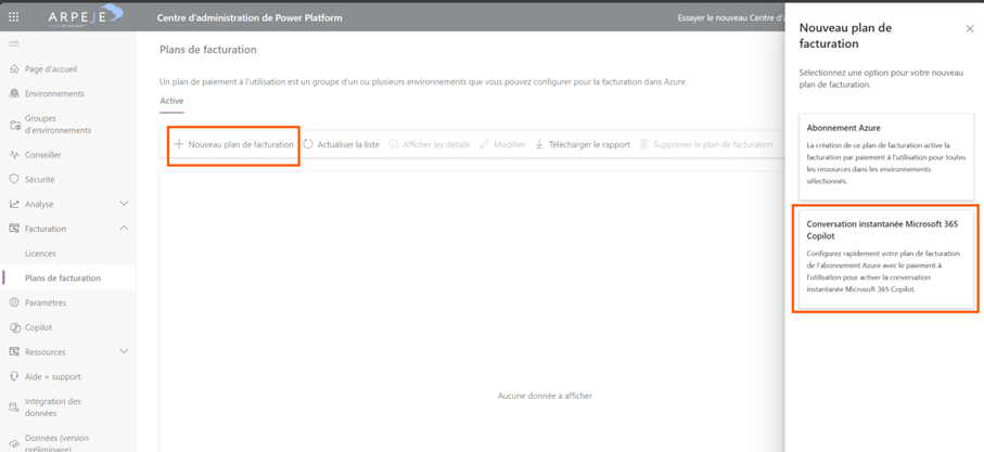 Dans le centre d’administration, allez dans « Copilot », puis « Paramètre », puis « Facturation avec paiement à l’utilisation Copilot », vous allez être redirigés vers le centre d’administration de la power platform